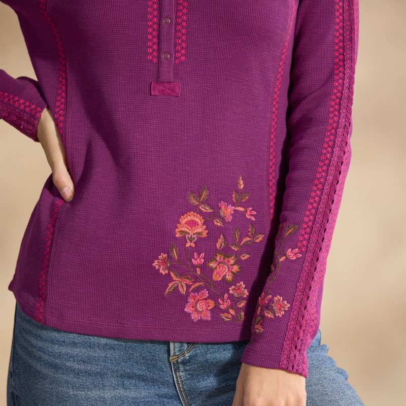 So flattering. our mock neck henley is blooming with stunning. multi colored floral embroidery. feminine lace insets at the sleeves and metal snaps at the placket. Princess seams. Cotton. Machine wash. Imported. Exclusive. Sizes XXS (00). XS (0–2). S (4–6). M (8–10). L (12–14). XL (16–18). Approx. 23l.
