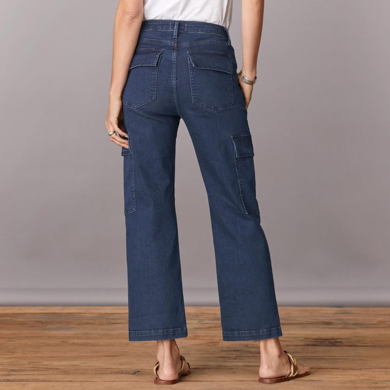 Straight leg. nicely stretchy jeans in a lovely dark wash with two cargo pockets. front slit pockets and attractive front seam detail. Cotton/polyester/spandex. Machine wash. Imported. Sundance exclusive. Sizes 24?C32. 27 inseam; 11.25 rise; 17.5 leg opening.