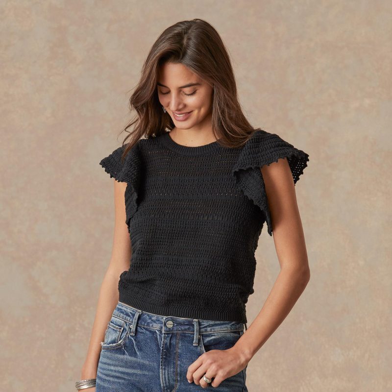 An open weave creates an airy feel to this sweet sweater. with flutter sleeves and a ribbed neckline and hem. Cotton/acrylic. Dry clean. Imported. Exclusive. Sizes XS (0-2). S (4-6). M (8-10). L (12-14). XL (16-18). XXL (20-22). Approx. 20.25l.