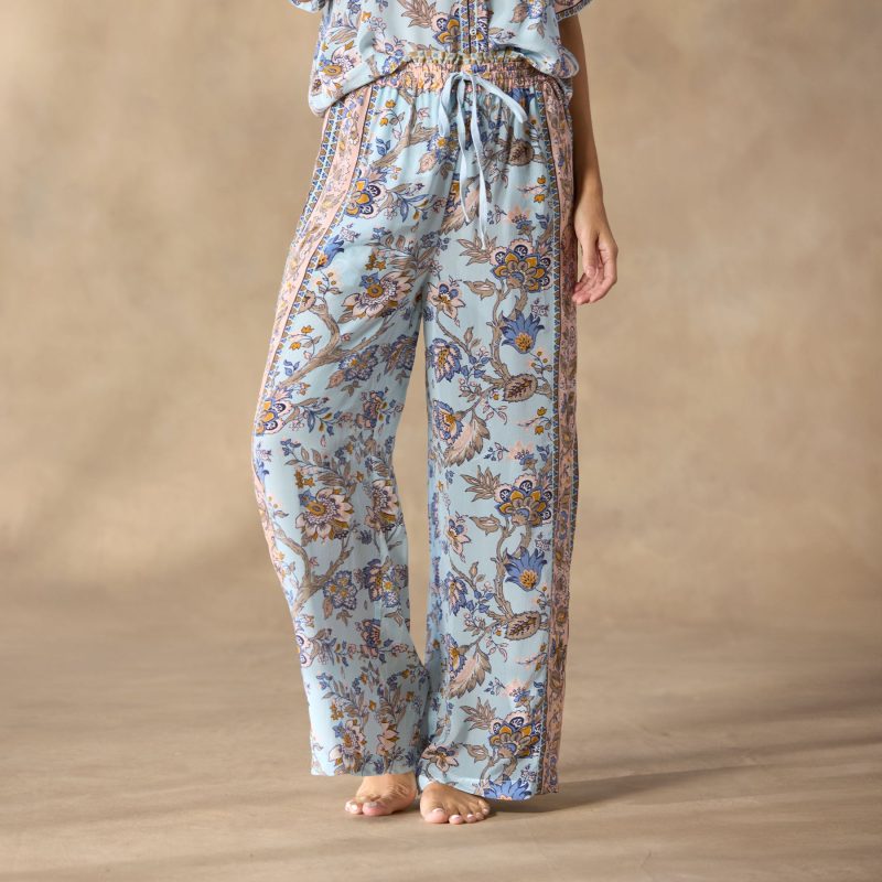 Silky and gorgeous mixed and border print pajama bottoms. so elegant. with wide leg silhouette. elastic drawstring waistband with ruffle detail and side seam pockets. Easy fit and flowing. Viscose. Machine wash. Imported. Exclusive. Sizes XS (0?C2). S (4?C6). M (8?C10). L (12?C14). XL (16?C18). XXL (20?C22). 28 inseam.