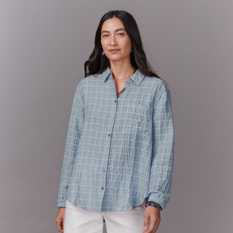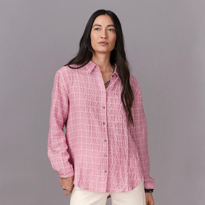 With a crinkle texture. front pocket and roll-up sleeves. this button-up shirt provides timeless comfort and style. Tencel/Rayon/Nylon. Machine Wash. Imported. Sizes XS (0-2). S (4-6). M (8-10). L (12-14). XL (16-18). XXL (20-22). Approx. 27.25l.