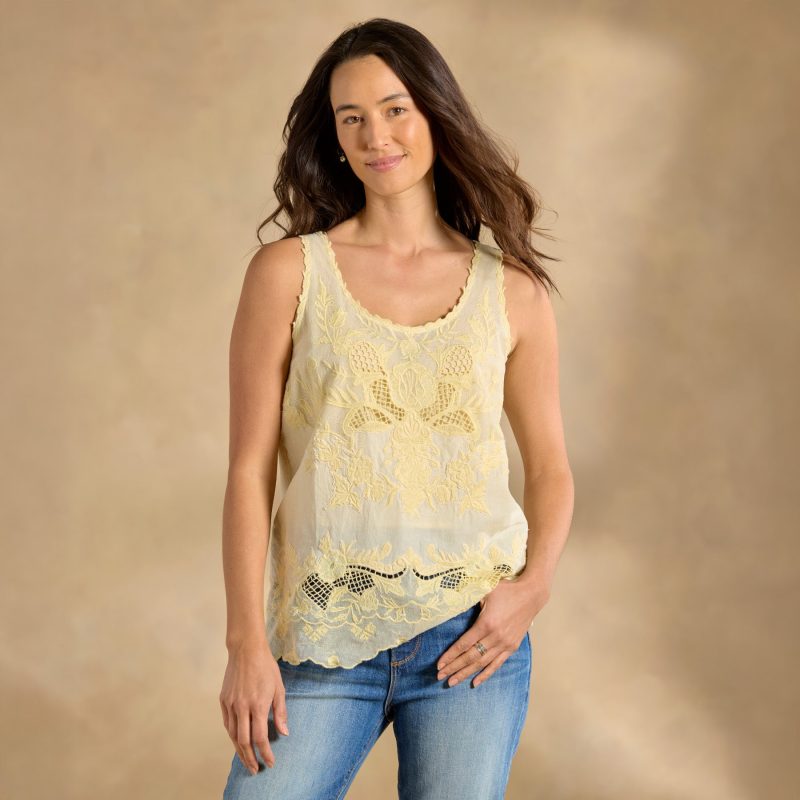 Openwork lace on our relaxed tank tells a beautiful story. Cotton/linen. Hand wash. Imported. Exclusive. Sizes XS (0–2). S (4–6). M (8–10). L (12–14). XL (16–18). XXL (20–22). Approx. 25l.