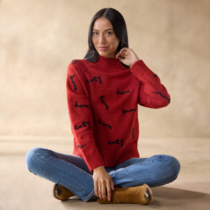 Our cozy sweater features the machine-embroidered sentiments cozy. home and snow. An allover rib with mock neck. rib trim. jersey roll neckline and exposed seaming at raglan sleeves. Acrylic/nylon. Hand wash. Imported. Exclusive. Sizes XXS (00). XS (0–2). S (4–6). M (8–10). L (12–14). XL (16–18). Approx. 21l.