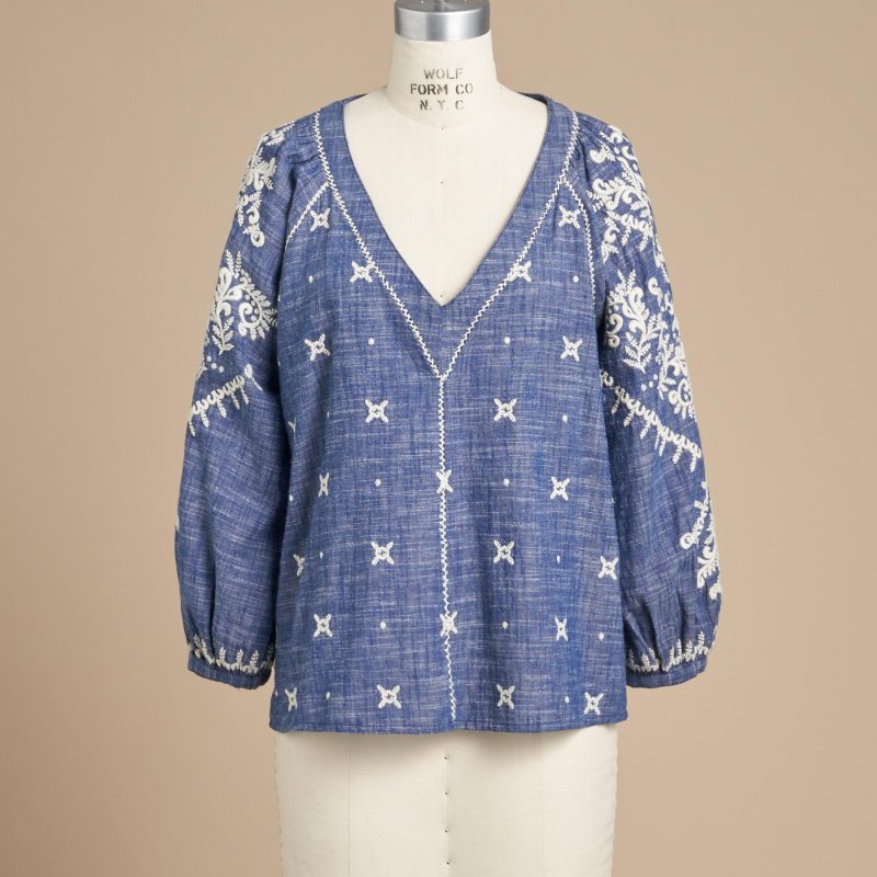 There’s joyful bohemian flair in this yarn-dyed top with luscious allover embroidery. blanket stitch details. three-quarter sleeves. shell buttons and V-neck. Full. easy fit. Cotton. Machine wash. Imported. Exclusive. Sizes XS (0 to 2). S (4 to 6). M (8 to 10). L (12 to 14). XL (16 to 18). XXL (20 to 22). Approx. 24-1/2L.