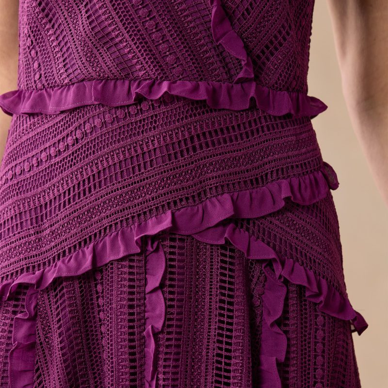 This stunning midi-length dress features a surplice front with ruffles. a handkerchief hem and linear lace with beautiful ruffle detail. Fully lined. back zipper. Polyester. Machine wash. Imported. Sizes XS (0-2). S (4-6). M (8-10). L (12-14). XL (16-18). XXL (20-22). Approx. 54l.