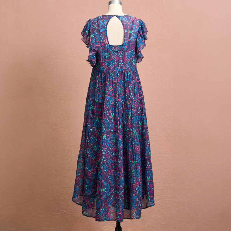 The airiest. printed cotton/silk midi dress. with three tiers. flutter sleeves. deep keyhole button back with covered button and loop and a separate printed slip. Easy popover styling. Machine wash. Imported. Exclusive. Sizes XXS (00). XS (0-2). S (4-6). M (8-10). L (12-14). XL (16-18). Approx. 46.75l.