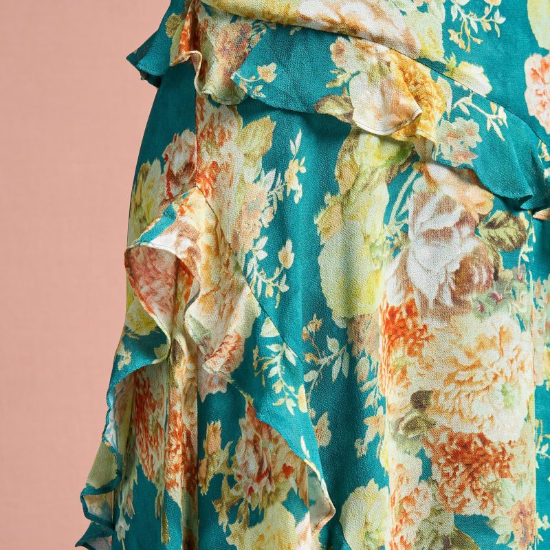 A gorgeous floral print enchants on our romantic dress. with angled. fluttery ruffles. asymmetrical hem. deep side slit. smocked neckline and keyhole button back. Fully lined. Viscose. Machine wash. Imported. Exclusive. Sizes XXS (00). XS (0-2). S (4-6). M (8-10). L (12-14). XL (16-18). Approx. 40.5.