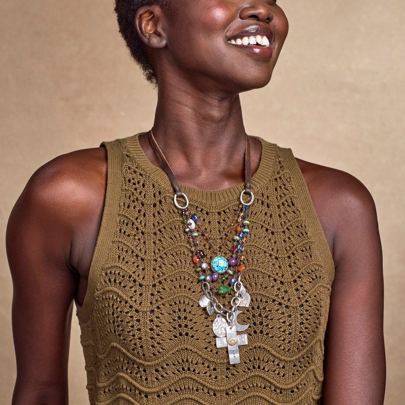 Conjuring a meadow in bloom. Jes MaHarry filled four tiers with kyanite. tourmaline. citrine and more. then added sterling silver links and charms. including a cross with a diamond at its 14kt gold heart. Leather laces; sterling slider. Handmade in USA. Exclusive. Adjustable to 28l. pendant 1-7/8 x 1-3/8.