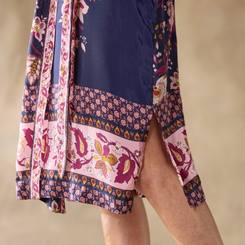 Flowing and feminine. our kimono-style. allover-engineered print robe has border prints. separate belt. side slits and pockets. Viscose. Machine wash. Imported. Exclusive. Sizes XS/S. M/L. XL/XXL. Approx. 44l.