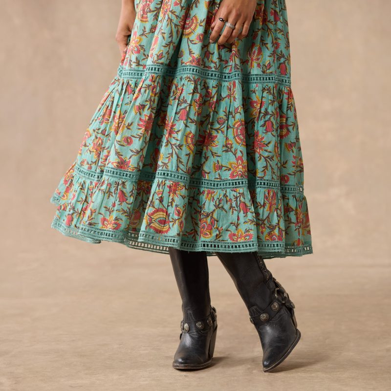Feminine and flowing. a palette of gorgeous florals with contrast border print details. pintucking. elastic waist. double flutter sleeves and tiered hem. Fully lined. Cotton/silk. Hand wash. Imported. Exclusive. Sizes XXS (00). XS (0?C2). S (4?C6). M (8?C10). L (12?C14). XL (16?C18). Approx. 49.5l.