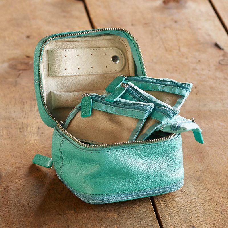 Uniquely hers. a leather jewelry case personalized with her initial and offering safe storage??six pockets in all??for precious trinkets and jewels. Microsuede lining. Zip closure. Exclusive. Approx. 4.75w x 4.5d x 4.5h. Choose to personalize it with a lowercase letter or leave it blank.
