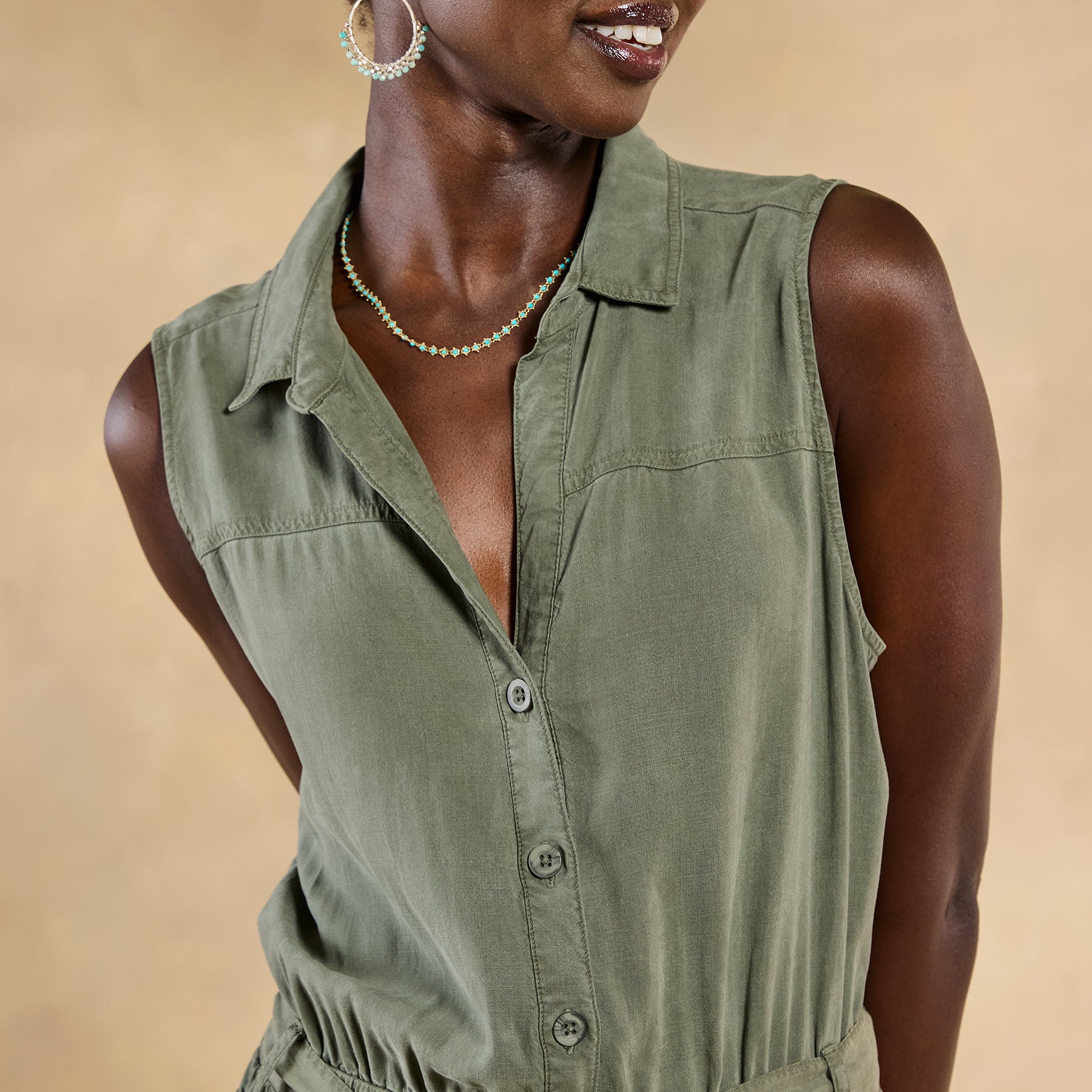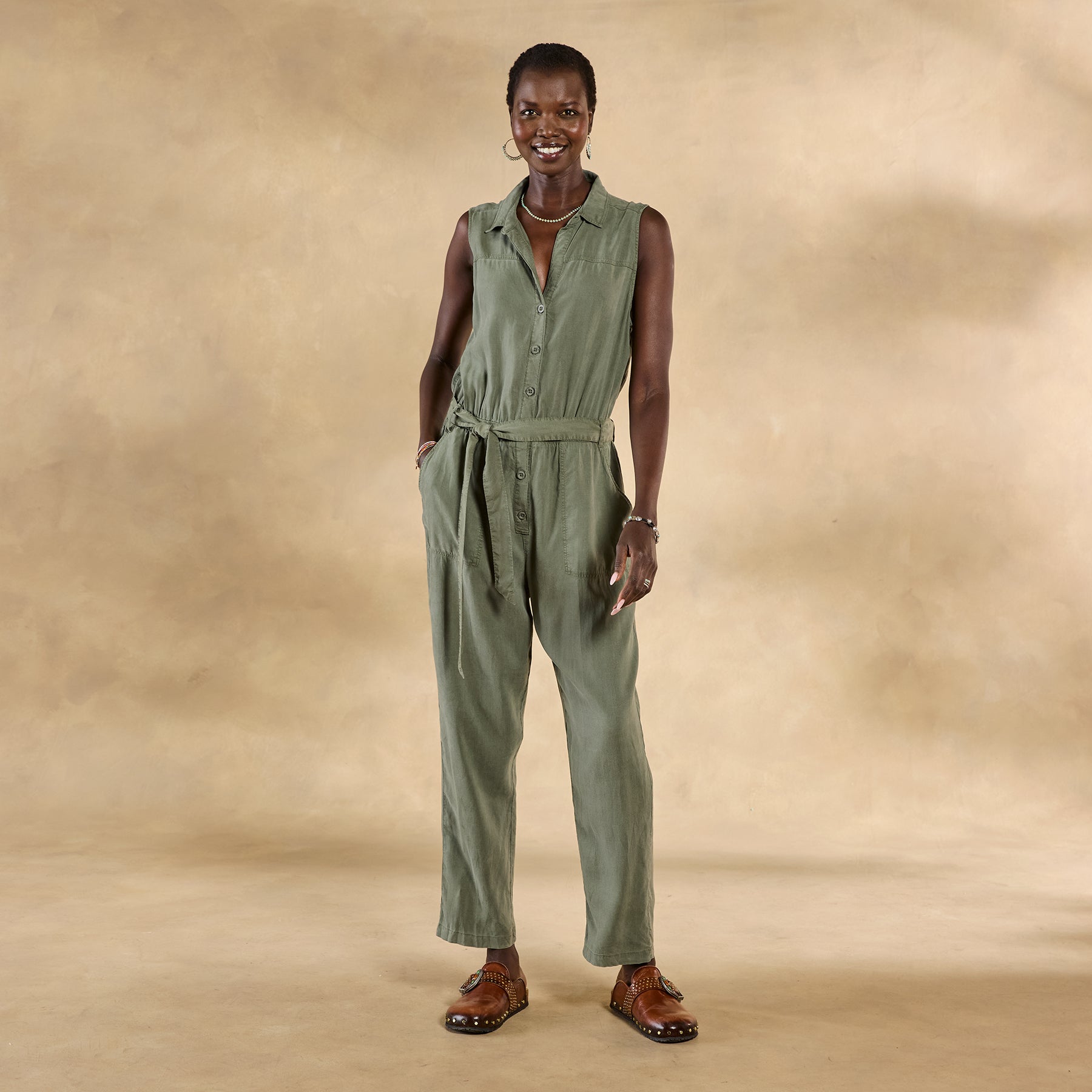So soft. our draping jumpsuit features elastic waist. two front pockets. roll hem and button front. Self-tie belt. Tencel. Machine wash. Imported. Sizes XS (0 to 2). S (4 to 6). M (8 to 10). L (12 to 14). XL (16 to 18). 28-1/2 inseam.