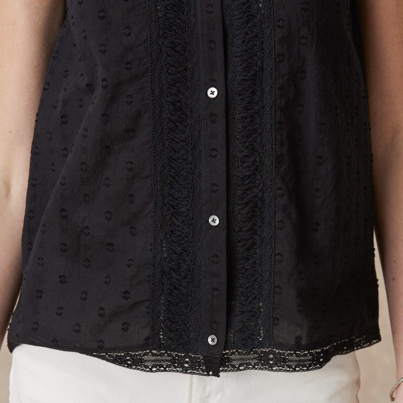 Feminine and textured. our special button down shell is a classic elevated. full of beautiful details with lace yoke. unique trim detail at the center front placket and shirring at the back. Cotton. Machine wash. Imported. Exclusive. Sizes XS (0–2). S (4–6). M (8–10). L (12–14). XL (16–18). XXL (20–22). Approx. 24l.