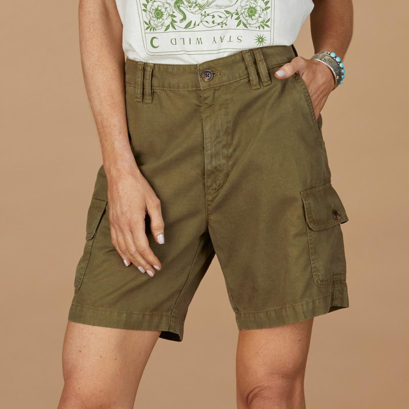 Flowing. comfortable safari-inspired shorts with fixed waist. slash pockets. side cargo pockets and back patch pockets. Zip fly. belt loops and faux horn accent buttons. Cotton/lyocell. Machine wash. Imported. Exclusive. Sizes 0?C14. 6 inseam.