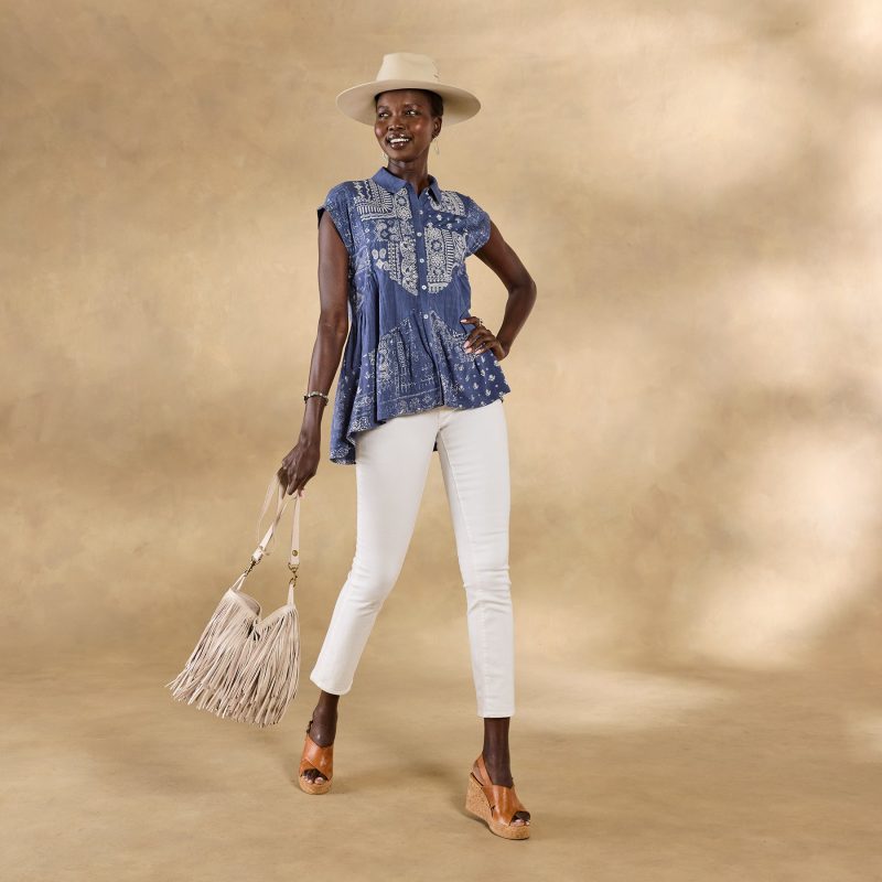 Thanks to its alluring print and lovely geometric embroidery. this mixed-media top can be dressed up or down. With button front. collar and a flattering A-line silhouette. Cotton/modal. Machine wash. Imported. Exclusive. Sizes XS (0–2). S (4–6). M (8–10). L (12–14). XL (16–18). XXL (20–22). Approx. 24l.