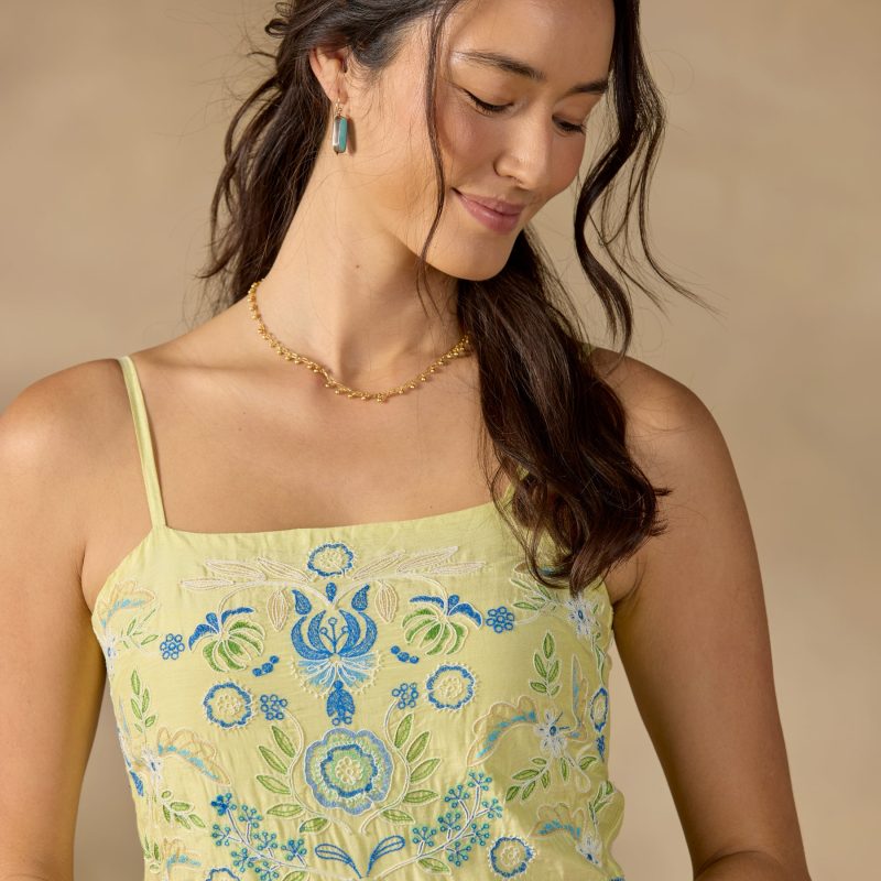 As bright and tangy as a sip of limoncello. our strappy Salina maxi is sure to be a standout all season??featuring delicate floral and geometric embroidery over three lovely tiers. Adjustable straps. side-seam pockets and center back zipper with smocking for easy fit. Fully lined. Silk/cotton. Machine wash. Imported. Exclusive. Sizes XS (0-2). S (4-6). M (8-10). L (12-14). XL (16-18). XXL (20-22). Approx. 54l.