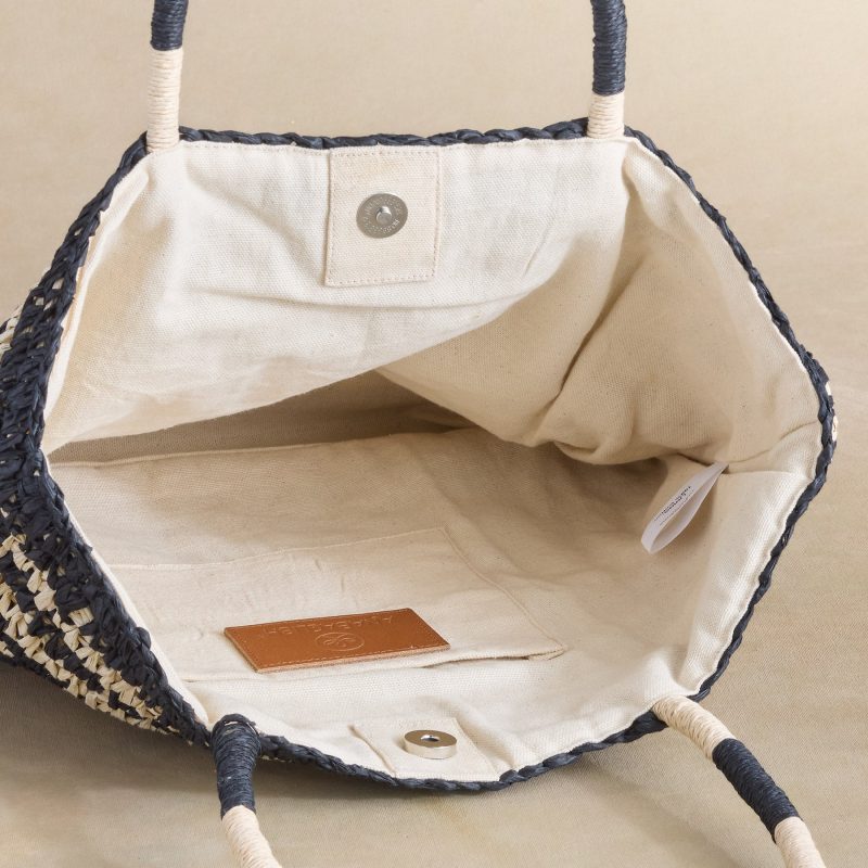 Our roomy. lightweight Sun Shadows tote is ready to accompany you on virtually any adventure! Black-and-natural raffia gets graphic with a staggered-stripe weave. Brass hardware; cotton lining. Imported. Approx. 16.75w x 5.25d x 13.5h; 8 strap drop.