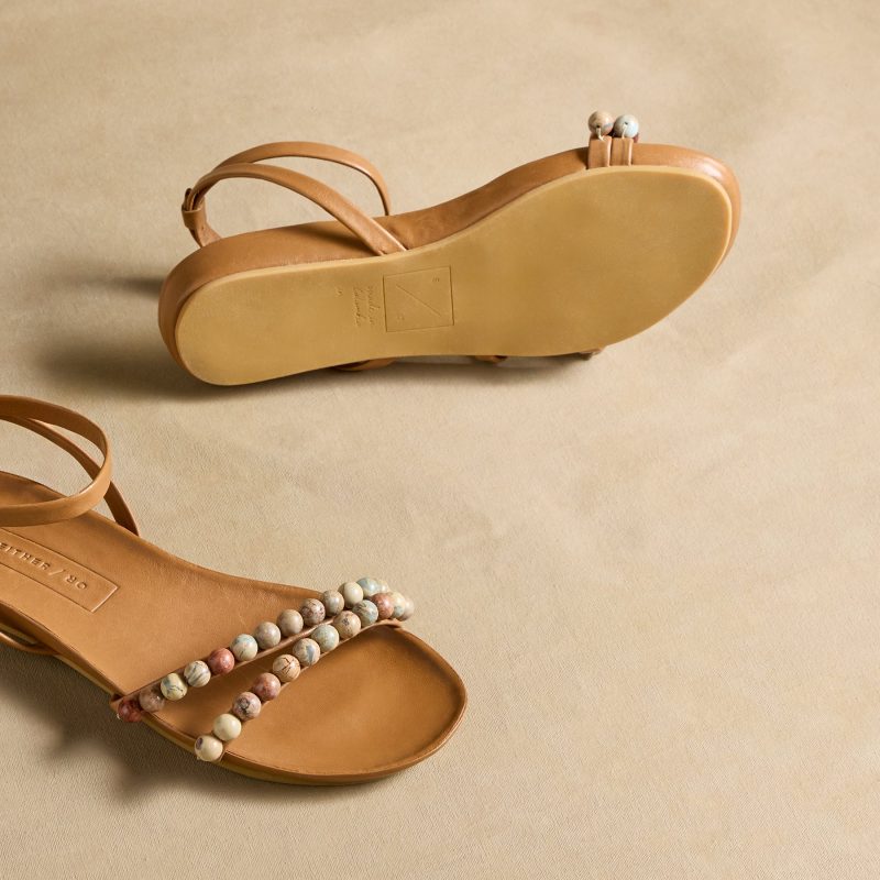 Handcrafted in leather. our Turin Sandals are laid-back with a touch of whimsy. Natural jasper beads add beauty across the two straps. Adjustable heel strap. Imported. Whole and half sizes 6?C10. 11.