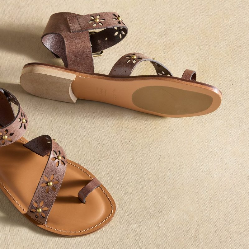Floral cutouts with stud centers highlight these handcrafted sandals with a toe loop. ankle buckle. decorative stitching and padded sole. Leather. Italy. Exclusive. Whole sizes 36 (US 5.5). 37 (US 6). 38 (US 7). 39 (US 8). 40 (US 8.5). 41 (US 9.5).