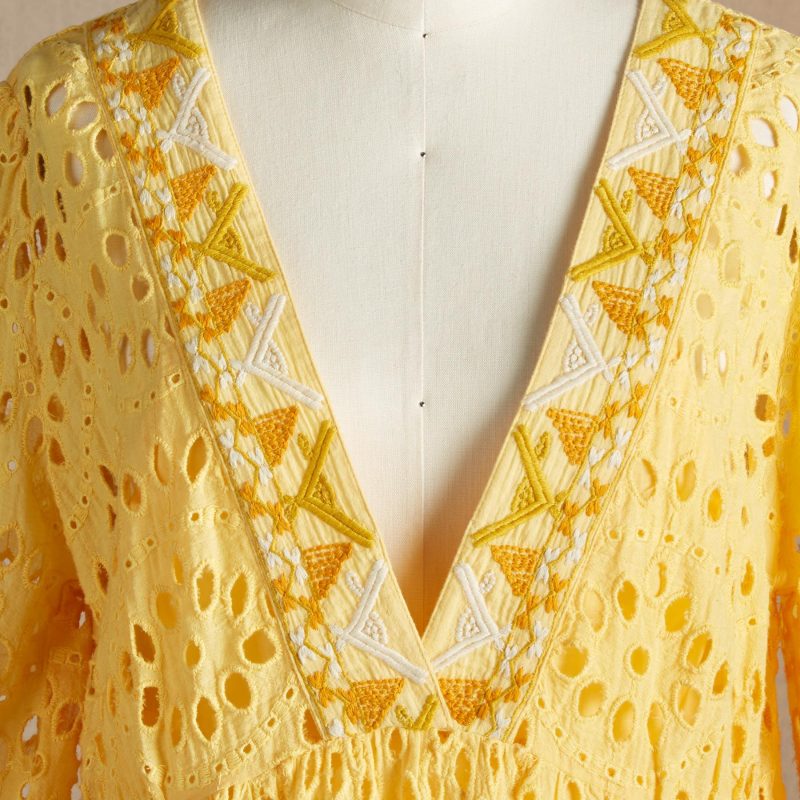 Stunning open eyelet sets the stage on our ruffle tiered dress with scalloping at the sleeves and hem. lovely embroidery at the placket. Removable slip included. Cotton. Hand wash. Imported. Exclusive. Sizes XS (0-2). S (4-6). M (8-10). L (12-14). XL (16-18). XXL (20-22). Approx. 36l.